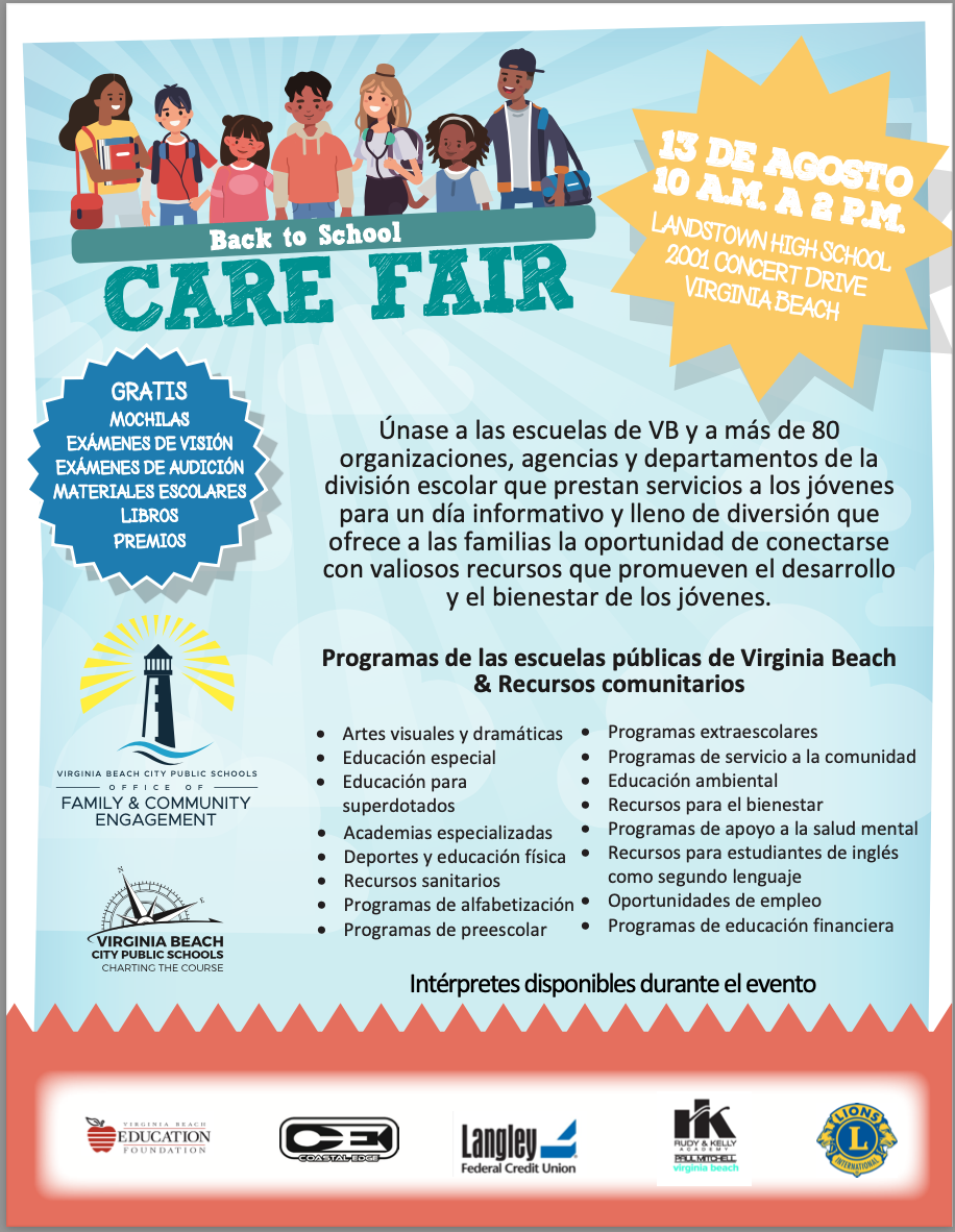 Join over 80 youth-serving organizations, agencies and school division departments at Landstown High School on Saturday, August 13 from 10am to 2pm for an informational fun-filled day that will give families the opportunity to connect with valuable resources to enhance youth development and well-being. This family friendly event includes hearing and vision screenings, haircuts, a backpack giveaway, food, prizes, and fun activities. We look forward to seeing you there!